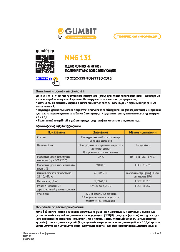 Клей NMG 131 – это ключевой компонент в производстве брусчатки, листов, матов и прочих сборных покрытий, которые характеризуются травмобезопасностью, долговечностью и упругостью. Идеально подходит для профессионального применения. Обладает оптимальной вязкостью. Образует качественную композицию вместе с водой и крошкой. Пропорции: клей Клей NMG 131 – 8-12%, крошка (заполнитель) – 86,5-91,5%, вода – 0,5-1,5%. От выбранной пропорции зависит плотность готового изделия.